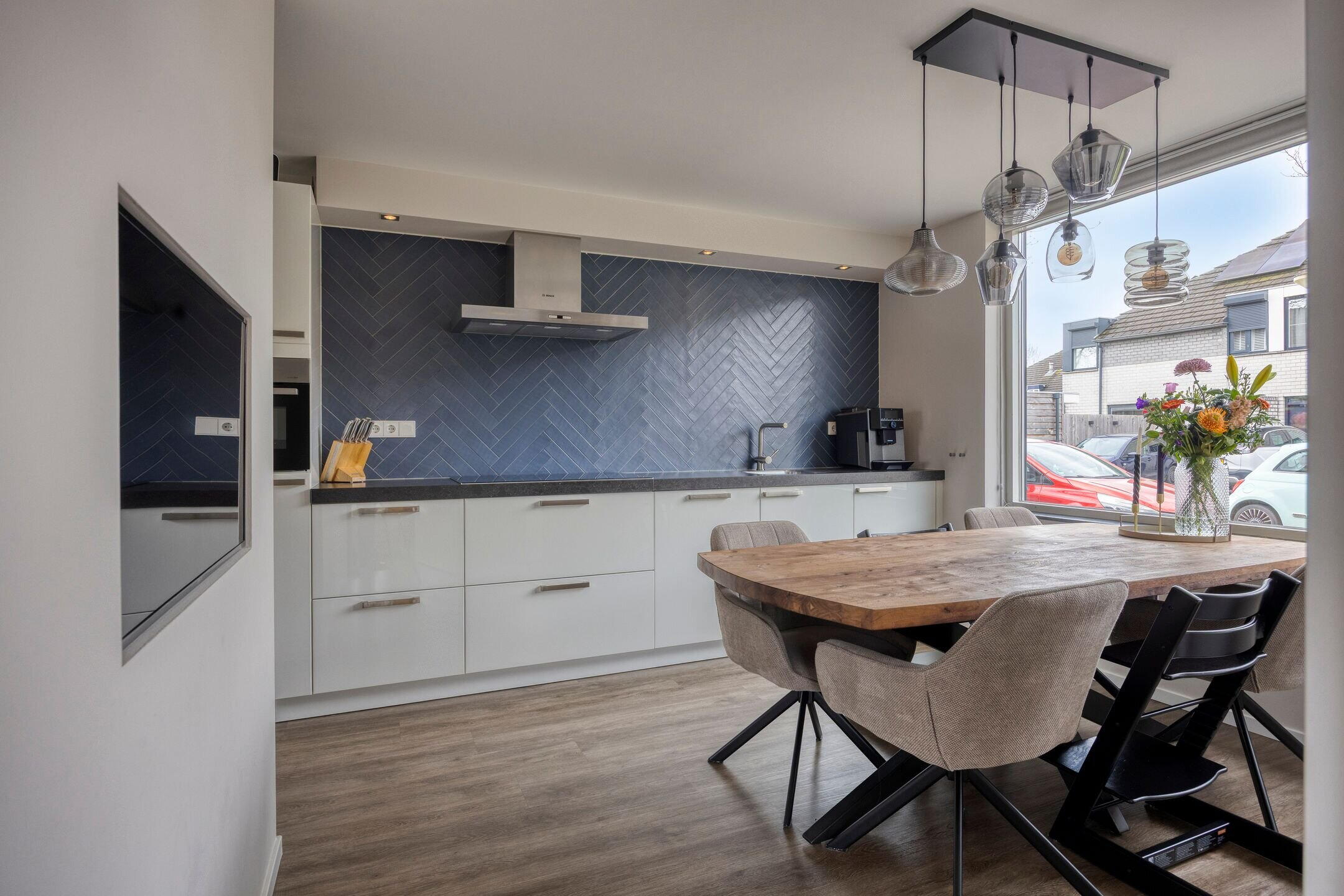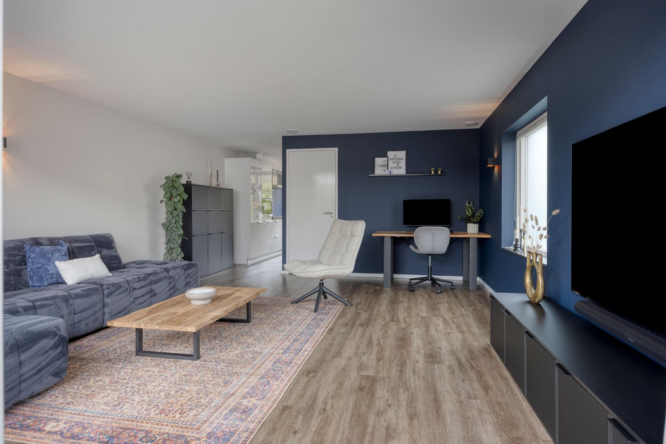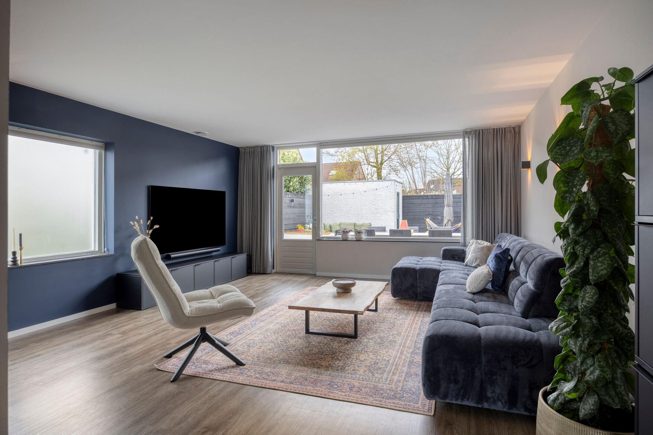 De keuken staat in directe verbinding met de ruime en lichte woonkamer. Hier zorgen grote raampartijen voor een prettige lichtinval. Daarnaast beschikt de woonkamer over een handige trapkast en toegang tot de achtertuin.