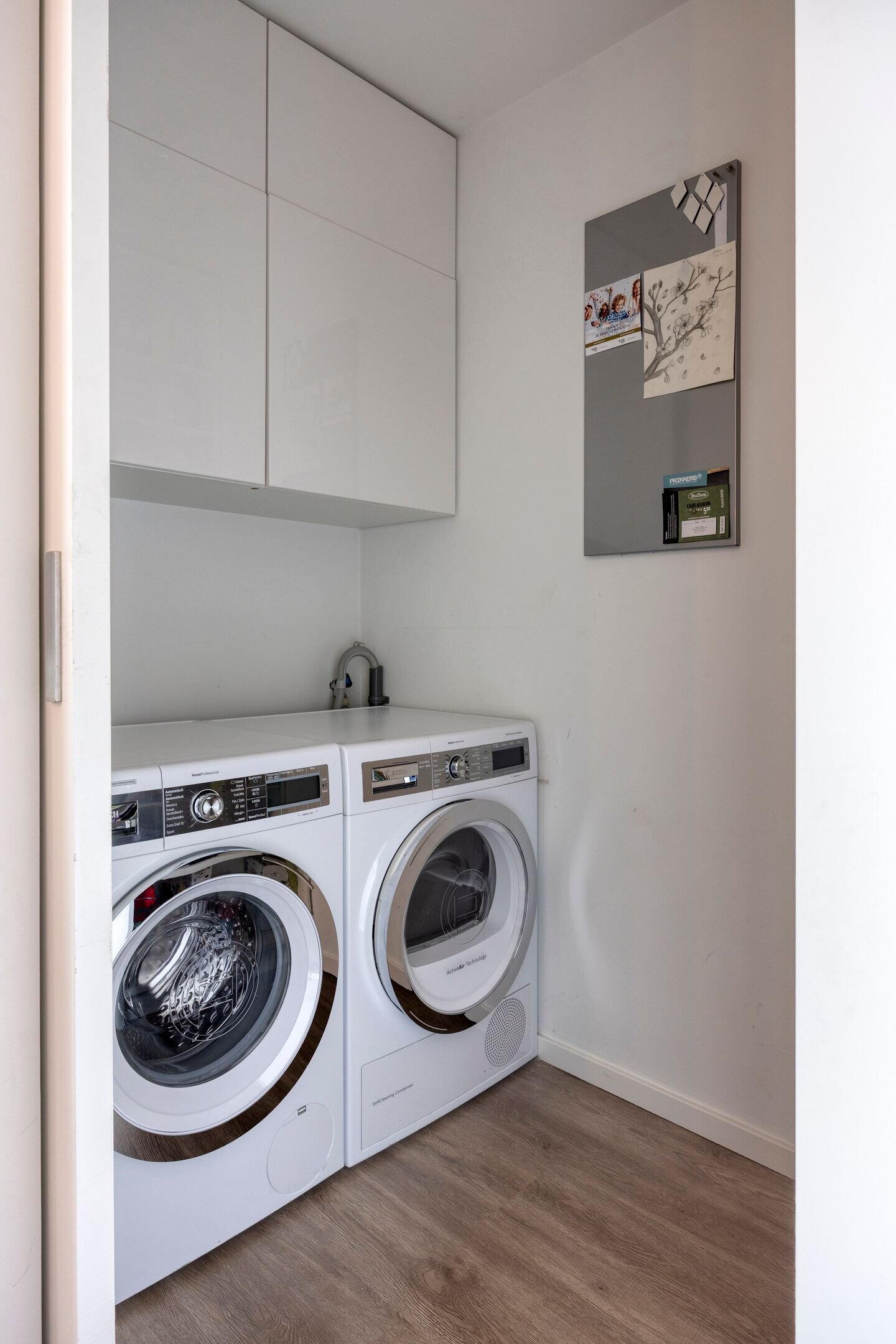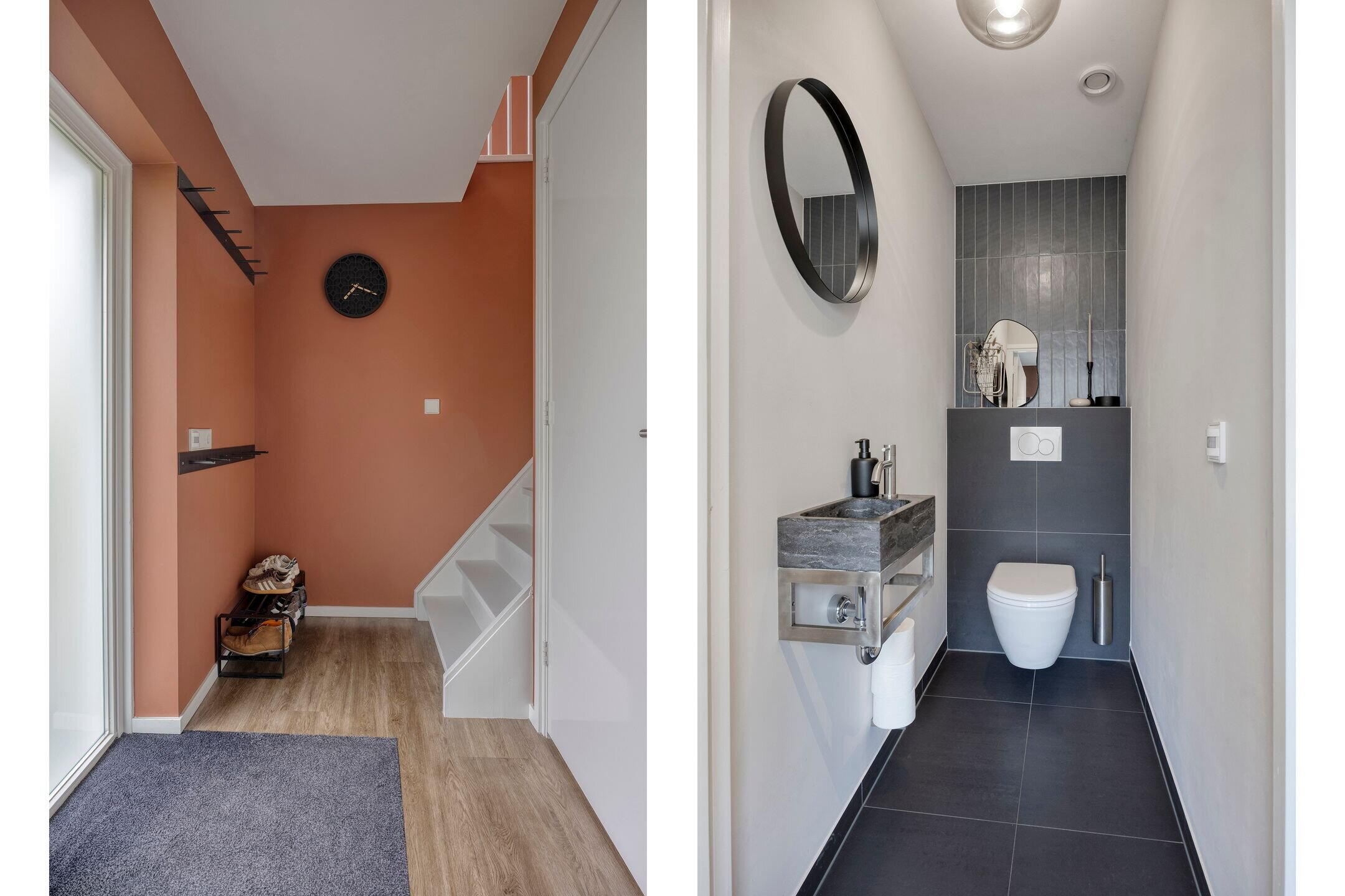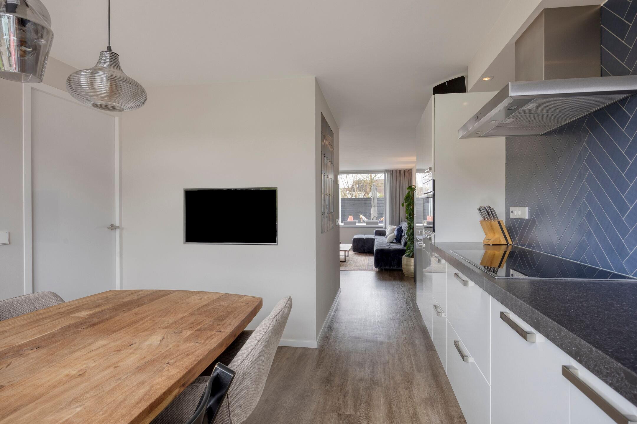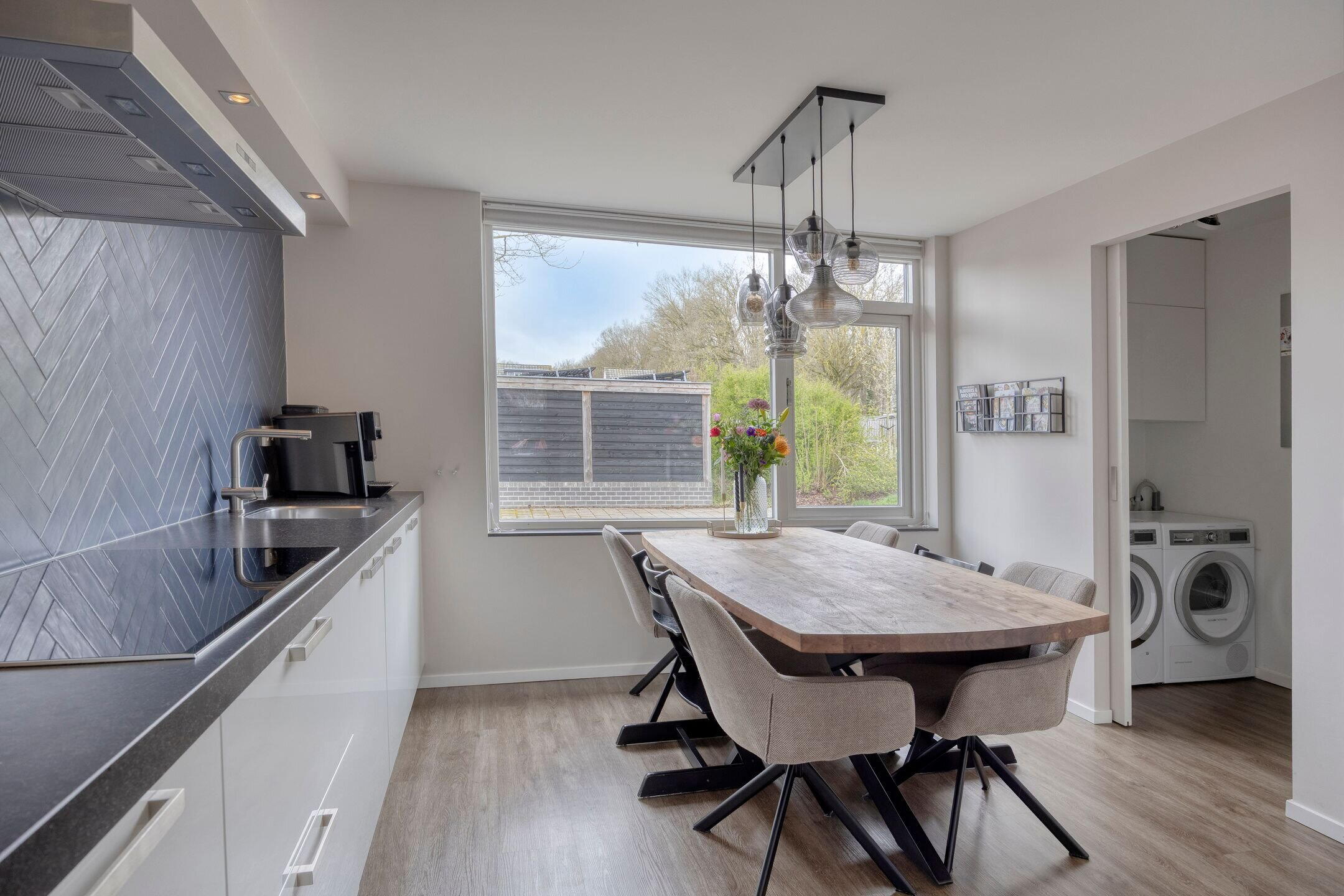 Bij binnenkomst treft u de hal met meterkast en een modern toilet met fontein. Vanuit de hal loopt u door naar de sfeervolle en complete leefkeuken. Deze is voorzien van diverse inbouwapparatuur, waaronder een vaatwasser, combi-oven, inductiekookplaat, koelkast en vriezer. Uniek detail is de ingebouwde televisie, wat de keuken tot een echte leefruimte maakt. Via een schuifdeur is de praktische wasruimte bereikbaar met aansluitingen voor wasmachine en droger.