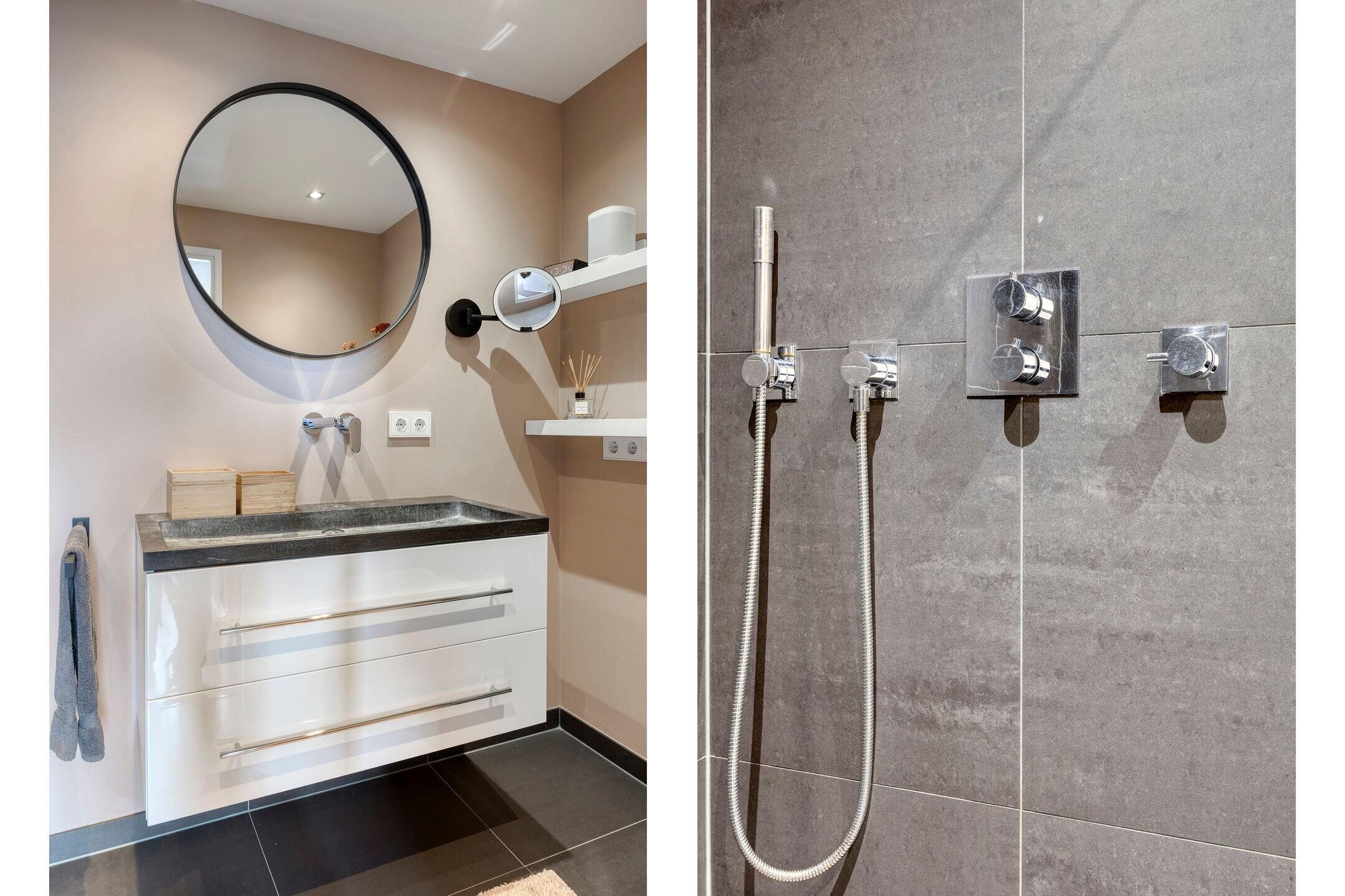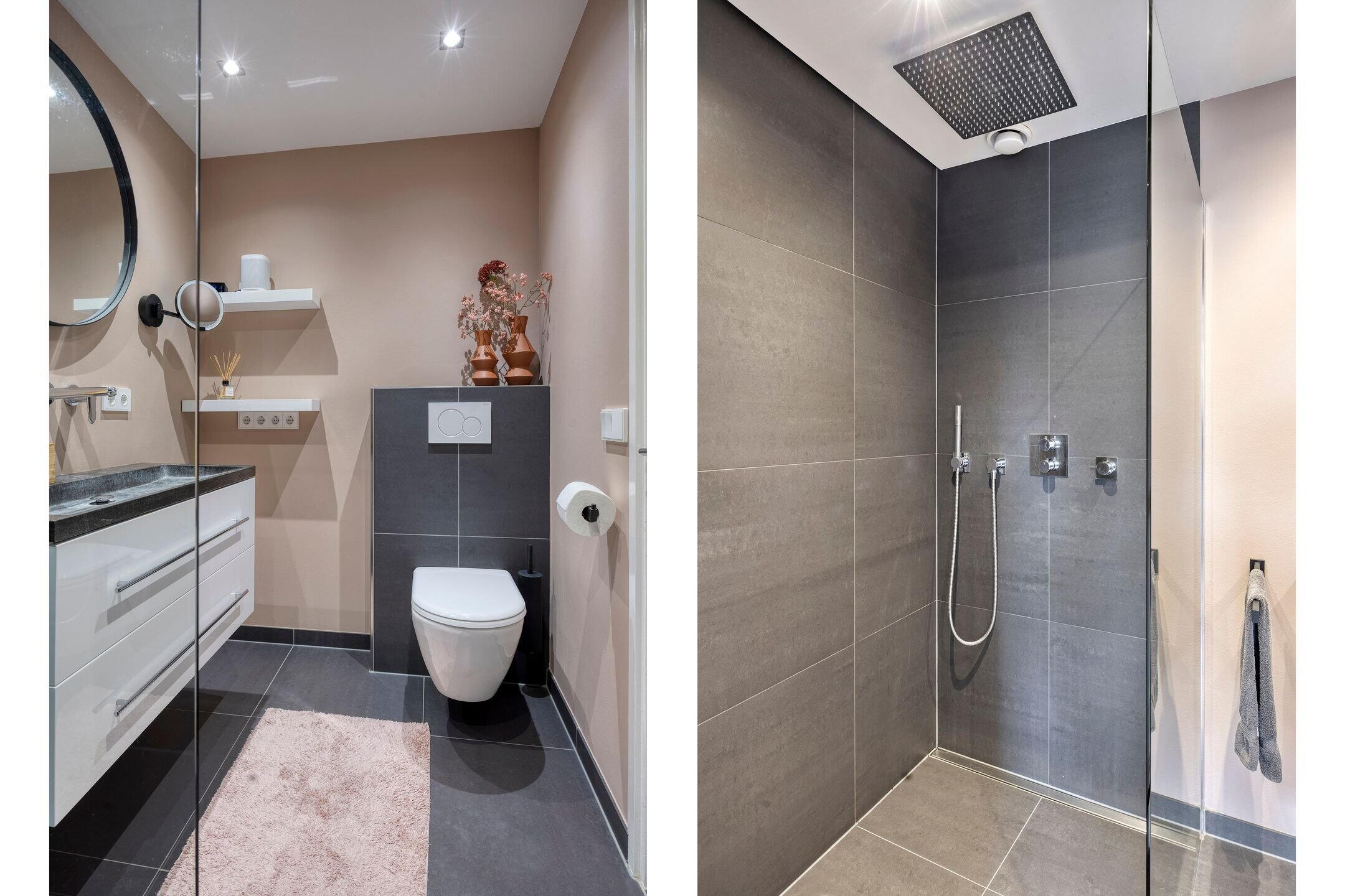 De moderne badkamer is compleet uitgevoerd met een toilet, een ruime inloop regendouche, een grote wastafel, sfeerverlichting en comfortabele vloerverwarming.