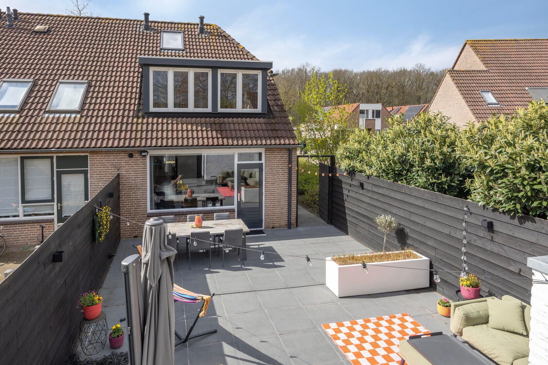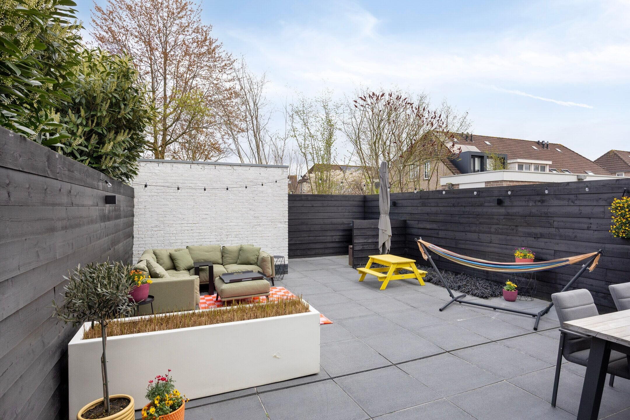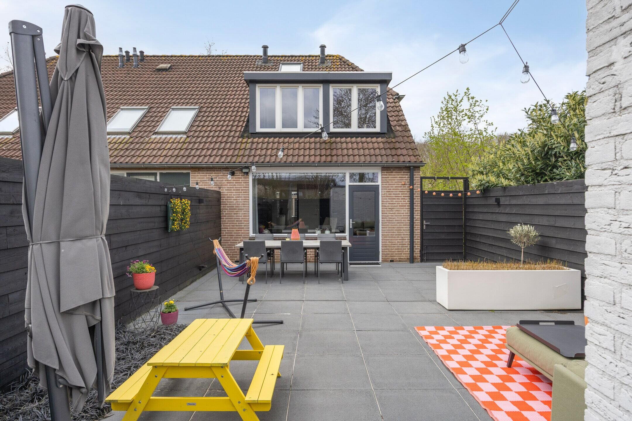 De fraai aangelegde achtertuin biedt veel privacy en is voorzien van grote 70x70 tegels met een drainagesysteem en een ruim terras. Hier kunt u in alle rust genieten, zonder inkijk.